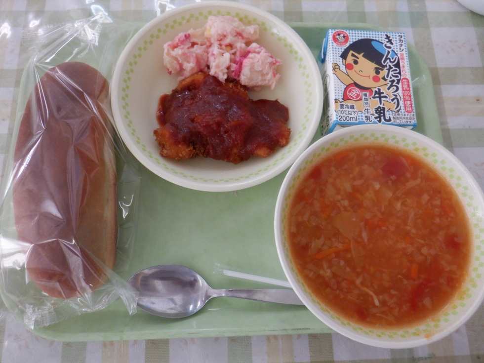 牛乳 黒パン ミラノ風ミネストローネ ミラノ風チキンカツレツ ピンクのポテトサラダ