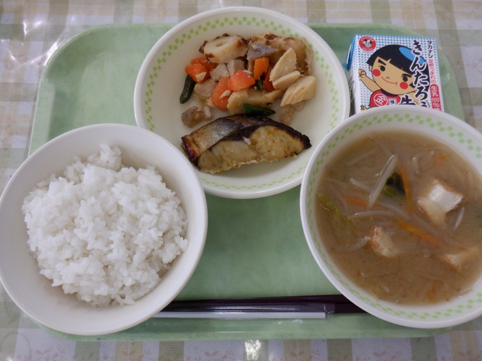 牛乳 ごはん もやしのみそ汁 あじのカレー焼き 筑前煮